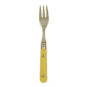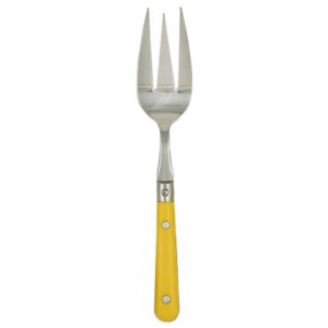 LePrix-Mimosa Yellow 4pc Hostess Set-18/0, mirror stainless steel. Contains: Serving Spoon, Pierced Serving Spoon, Cold Meat Fork, and Sauce Ladle