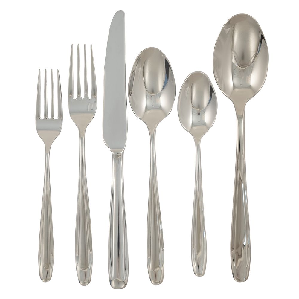 Madison 42pc Set-18/10 Stainless with mono-block (solid) knives. 8 each: Dinner Knife, Dinner Fork, Dinner Spoon, Salad Fork, Teaspoon, and 2 Serving Spoons.