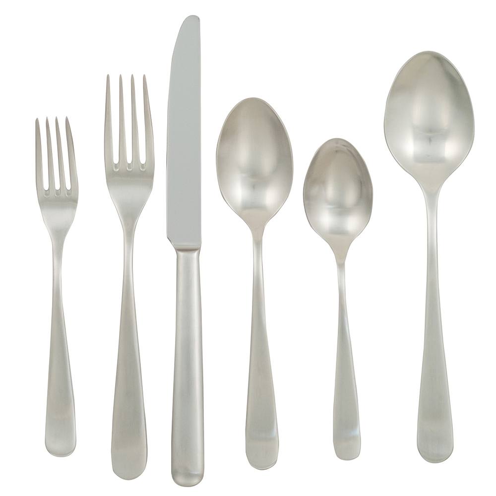 Millennium Satin 42pc Set-18/10 Stainless with mono-block (solid) knives. 8 each: Dinner Knife, Dinner Fork, Dinner Spoon, Salad Fork, Teaspoon, and 2 Serving Spoons.
