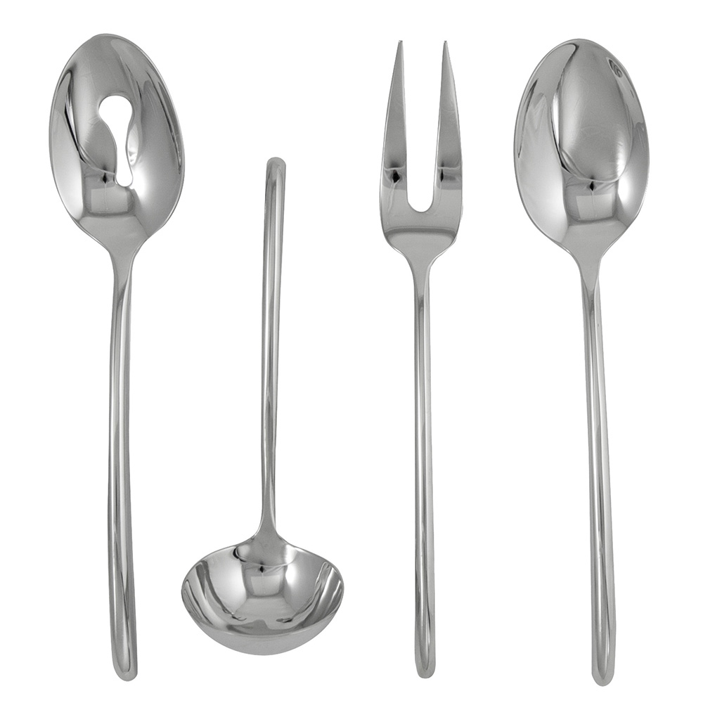 Flight 4pc Hostess Set-18/10 Stainless Steel. Set Contains: Serving Spoon, Meat Fork, Pierced Serving Spoon, Sauce Ladle