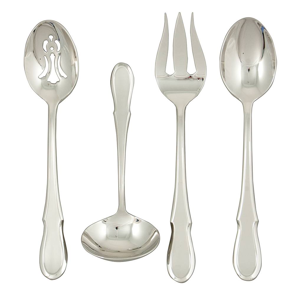 Celine Platinum 4pc Hostess Set-18/10 heavy, stamped stainless steel. Contains: Serving Spon, Cold Meat Fork, Pierced Serving Spoon, Sauce Ladle
