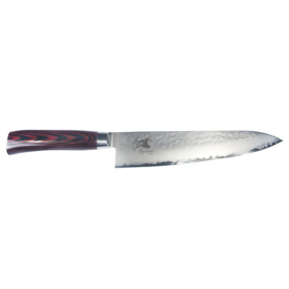 8″ Chef Knife-Hayabusa Cutlery Collection-Made in Japan-3 layers; VG5 Core, SUS410 stainless outer layers. Hammered and bead blast finish with red/black linen micarta handles