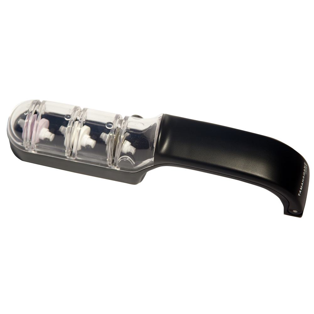 Water Sharpener with 3 Wheels; Coarse diamond grit (grey wheel), Medium grit (white wheel), and fine grit (pink wheel). Use with water.